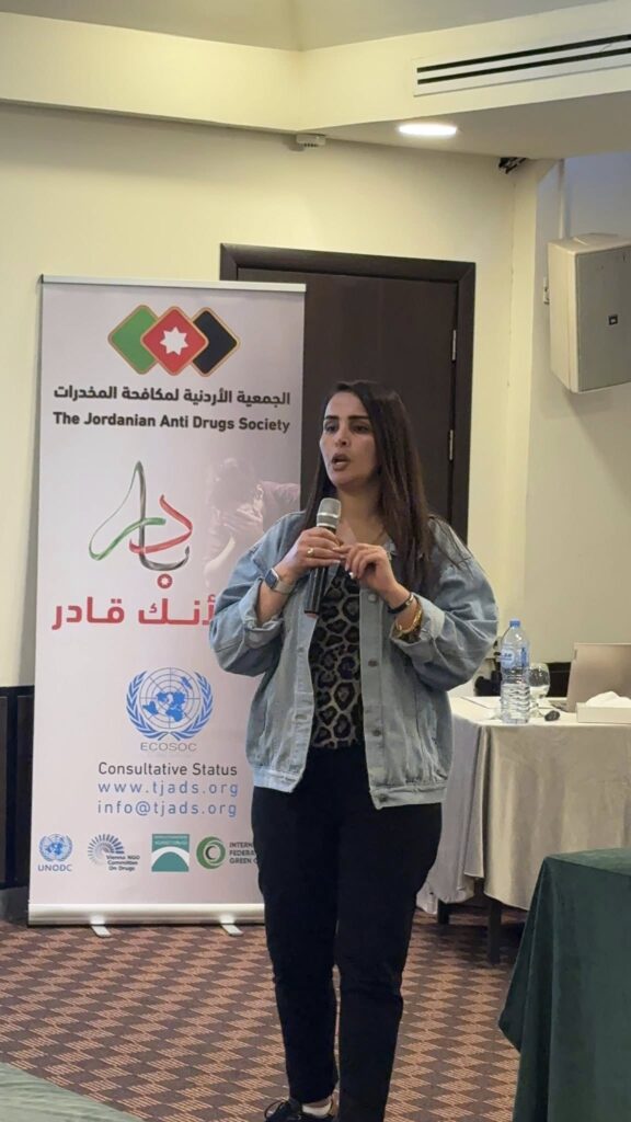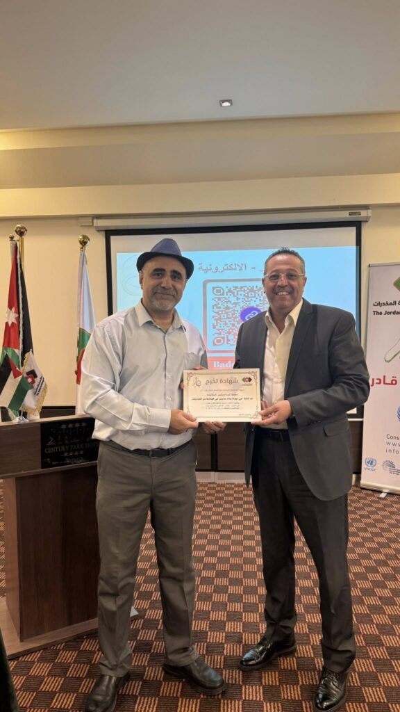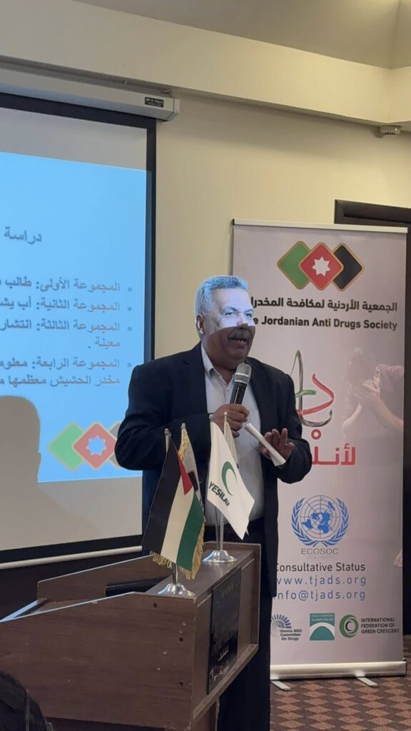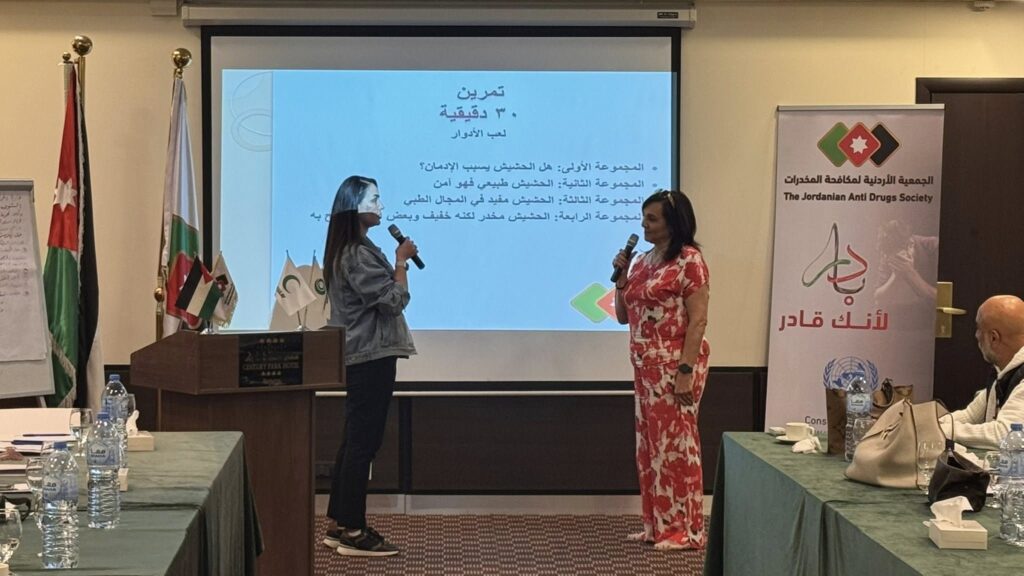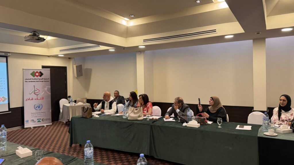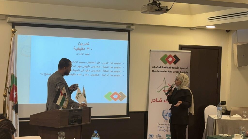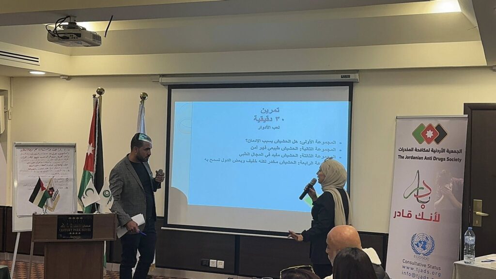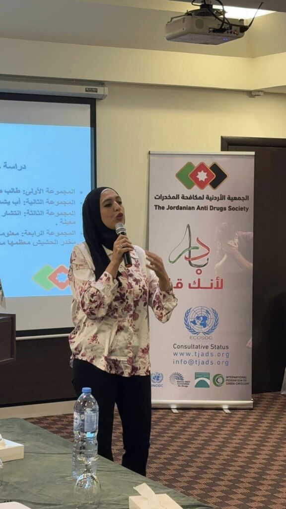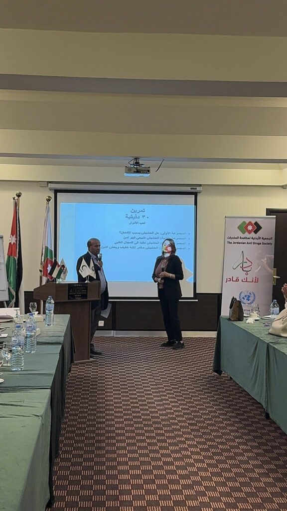ضمن برنامج بناء قدرات أعضاء الجمعية الأردنية لمكافحة المخدرات (TJADS) تم اليوم تنفيذ دورة تدريبية نوعيّة تهدف لرفع كفاءة أعضاء الجمعية في مهارات الإلقاء، وتصميم محاضرات التوعية، وتطوير قدراتهم في العمل الوقائي.